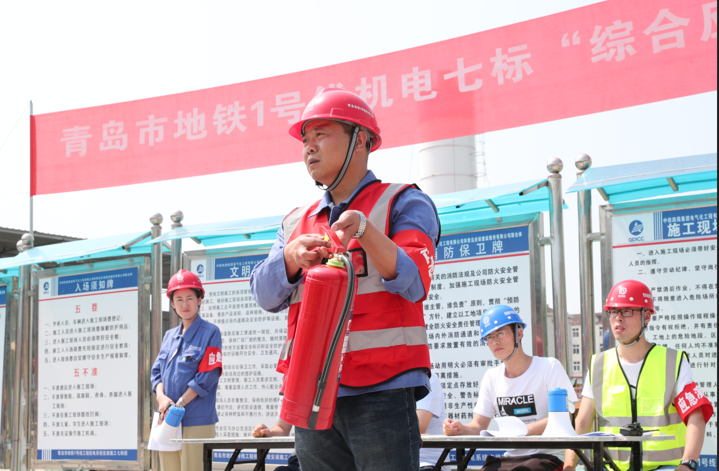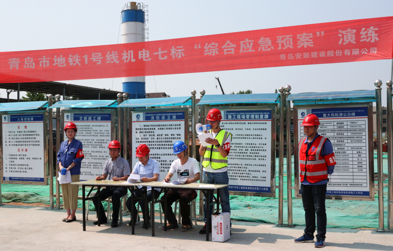 為扎實開展2019年“安全生產(chǎn)月”活動,牢固樹立“生命至上,安全生產(chǎn)”理念,全面提升安全生產(chǎn)事故應(yīng)急救援處置能力,2019年6月14日下午,我公司聯(lián)合中鐵四局地鐵項目部在青島市地鐵1號線工程機電系統(tǒng)施工七標(biāo)段遵義路站站區(qū)開展了一次以“防風(fēng)險 除隱患 遏事故”為主題的安全生產(chǎn)事故應(yīng)急救援綜合演練活動,公司黨委書記、常務(wù)副總經(jīng)理張衛(wèi)財出席活動,安環(huán)部主任馬世革、中鐵四局、監(jiān)理公司、各分公司負(fù)責(zé)安全生產(chǎn)的副經(jīng)理、專職安全員及安環(huán)部全體人員共計80余人到現(xiàn)場觀摩演練。中鐵四局青島地鐵1號線機電七標(biāo)項目經(jīng)理劉洋擔(dān)任演練總指揮。公司商務(wù)經(jīng)理姜曉紅擔(dān)任主持人。
